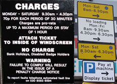 Residents have been fined for using the parking bays outside the Nat West Bank. In the belief that it is a pay and display bay, they go to the ticket machine which says that charges apply between 9.30am and 4.30pm. However another smaller sign indicates that parking is restricted between 8am and 6.30pm (See picture left).