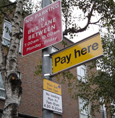The signs on the other side of the road are similarly confusing. There is a larger red sign saying that you should not park in the bus lane which is operational only from 7 a.m. to 10 a.m. and there are bays marked out in the bus lane and a ticket machine asking for payment from 10 a.m. But smaller plates say no waiting from 7 a.m. to 7 p.m. See picture below: