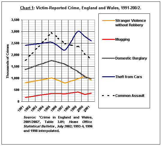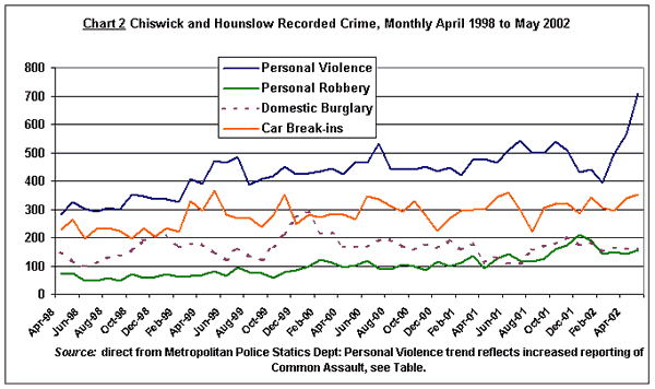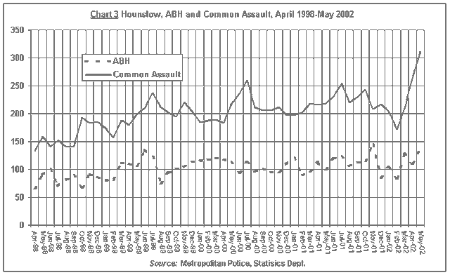 This makes recent recorded crime figures difficult to interpret. It is my impression that at least in respect of some crimes, the Hounslow and Chiswick police district made the changeover between February and April this year (2002). This would explain the otherwise unexplained near-doubling of cases of Common Assault recorded by police in the Borough between those two months. (See Chart 3 below).