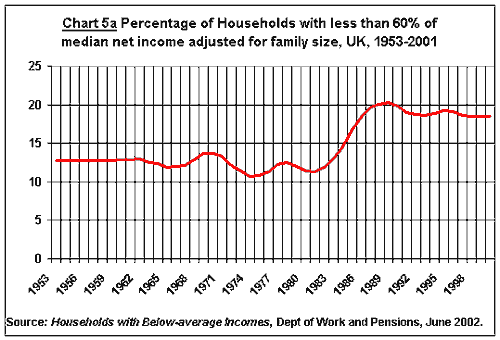 Then in the middle nineteen-eighties, condition (2) went sharply in the wrong direction. Between 1985 the proportion of households below 60% of the median net income rose from 10% to 20%. (See Chart 5a)