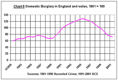 Chart 6 is a statistical series which 'splices' the police-recorded data before 1990 with the BCS data thereafter. I think that is a reasonably accurate procedure because there is indirect evidence of police under-recording of burglaries in the period 1990-1995 as they were, in effect, partly overwhelmed by the crime wave.