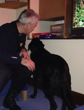 The crew looked after the dog, called Easy, during the evening before his owner came back to collect him after being released from hospital. They were delighted to be reunited.