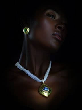 Green Tourmaline earrings set in Gold - £10,000 Gold and Seed Pearl Necklace set with Blue Topaz and Diamond - £12,000