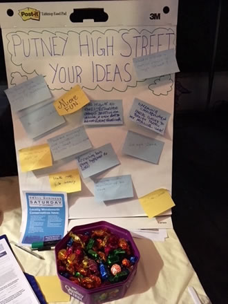 The options for improving Putney High Street were on display at a Councillors’ stall in Putney’s Winter Wonderland on Small Business Saturday in December. Small Business Saturday, supported by the Council, encourages residents to explore their neighbourhood shops and ‘buy local’. Councillors were on hand to explain the High Street improvement options and residents were invited to stick comments on an ideas board, while helping themselves to chocolates!