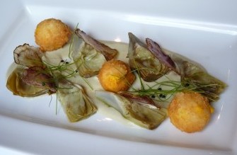 Artichoke "alla giudea" with cream of leeks and provolone fonduta Seared cuttlefish with artichoke panzanella *** Ravioli filled with ricotta Piemontese and artichoke, truffle and butter sauce Fillet of brill with artichoke, fennel and burrata parmigiana, olive and caper sauce Roast breast of guineafowl filled with artichoke, leg sausage, fresh peas and spring onions *** Neapolitan ricotta cake with sour cherries Caprese chocolate cake with limoncello cream sauce Selection of sorbets and ice creams |