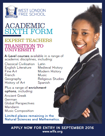 The West London Free School Sixth Form is an exciting new option for students living in London who are looking for a stepping stone to the best universities in the UK and beyond. A limited number of places are available for entry in September 2016 for current Year 11 students who expect to achieve five GCSEs at A*-B. See note at bottom.