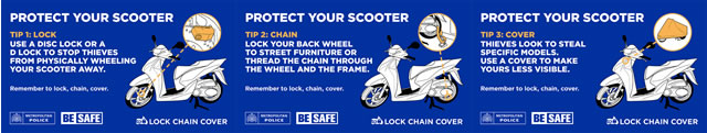 Last week the Met launched its new ‘Be Safe’ campaign, “LOCK, CHAIN AND COVER your scooter to make it less visible to thieves”. This urges riders of scooters, motorcycles and mopeds to use extra security on their vehicles to make it harder for thieves to steal them.