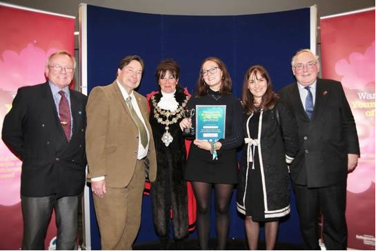 She is pictured with the Mayor and Rotarians from the South-West Group of Rotary Clubs which helped to sponsor the evening. President Tony Chase (left), Youth Specialist Chris Wyatt (second from left) and Treasurer Leslie McDonnell (right) represented the Rotary Club of Putney.