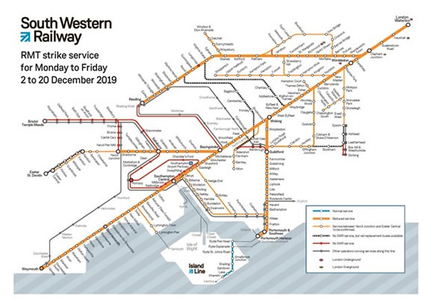 While the RMT has informed SWR that they will not be striking on 12 December, owing to the prolonged nature of the strike it will not be possible to provide trains and crews in the correct locations to operate a normal timetable. As a result, there will also be an amended timetable on that day.