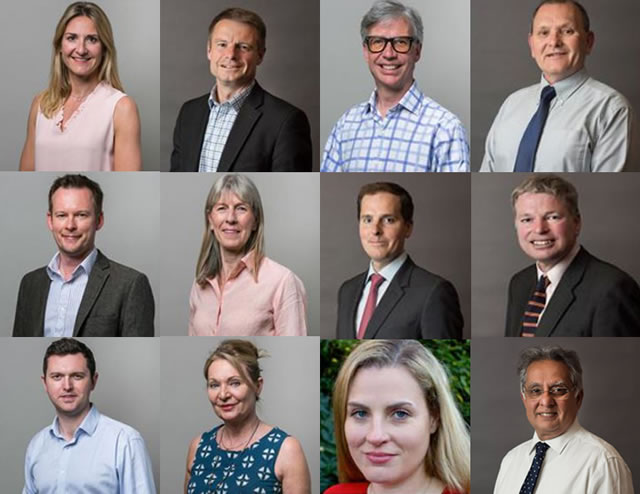 Top row left to right Kim Caddy, Jonathan Cook, Guy Humphries & Paul Ellis. Middle row John Locker, Sarah McDermott, Will Sweet and Guy Senior. Bottom row Rory O'Broin, Steffi Sutters, Clare Salier and Ravi Govindia