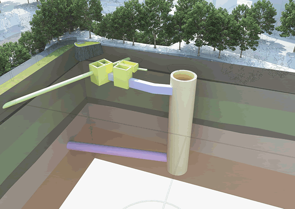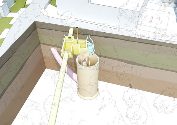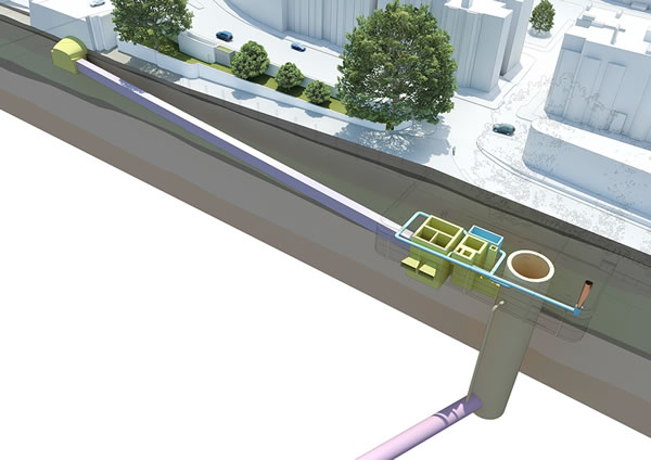 Work includes construction of underground structures to connect the combined sewer overflow (CSO) to a shaft approximately 36 metres deep with an internal diameter of approximately six metres. This shaft will be constructed within the river foreshore at the main site, and will transfer sewage flows from the CSO to the main tunnel. While most of the operational structures will be underground, two electrical and control kiosks and two ventilation columns will be required.
