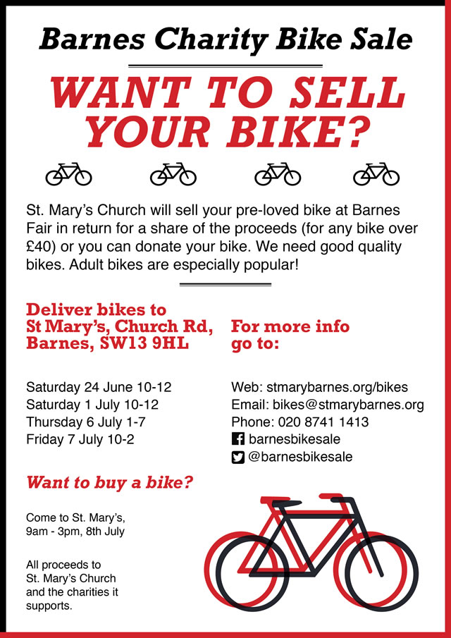If you have a bike to sell please see www.facebook.com/barnesbikesale or www.stmarybarnes.org/bikes for further details you can deliver your bike(s) to St Mary’s on June 24th, July 1st & 7th between 10-12 and July 6th between 10-12. If you need a bike, see you in the churchyard on 8 July.
