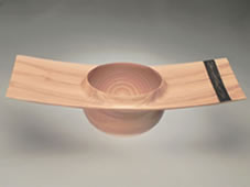 Kevin Hutson creates unusually architectural pieces from turned wood. Hutson trained in carpentry and joinery, and worked in architectural joinery, which inspired his later experiments in creative forms. Hutson blends subtle surface tones of colour to emphasis the grain found in the wood, and the clear inspiration of Oriental architecture creates movement within each piece.