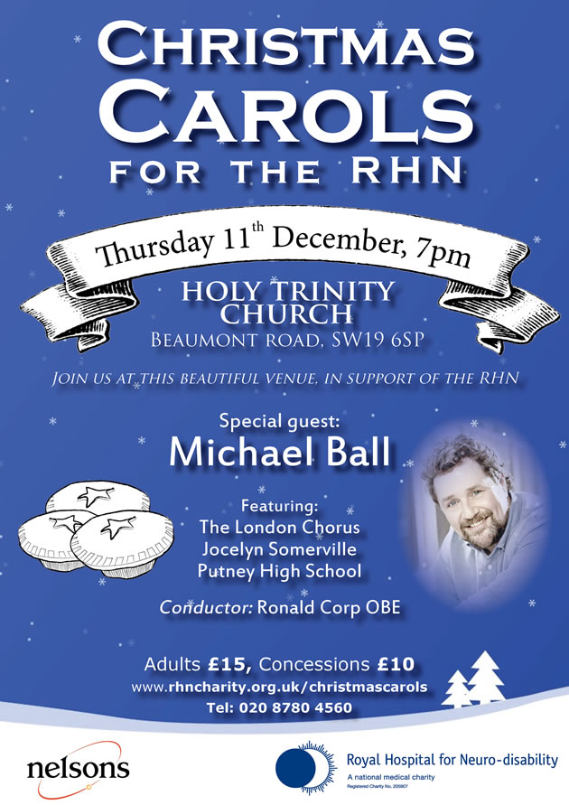 The Royal Hospital for Neuro-disability is pleased to announce that West End star, Michael Ball will be performing at their annual Christmas Carol Concert. He will be joined at the beautiful Holy Trinity Church, Putney, by the London Chorus, led by conductor Ronald Corp OBE, soloist Jocelyn Somerville and the Junior Choir of Putney High School. All funds raised will go towards supporting Music Therapy at the Royal Hospital for Neuro-disability, enabling patients to enjoy the therapeutic benefits of music.