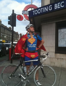 SuperCyclingMan seen left setting off from Tooting in the direction of Turkey, is the alter ego of Will Hodson or Mr Hodson as he is better known to the children at the Brandlehow Primary School he teaches at in Putney, London - and he will be back when term starts kids!