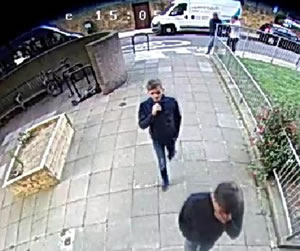 The second man is described as white, aged in his thirties, with short facial hair and rimless glasses. He was wearing a dark grey bomber jacket.