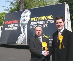 At last Thursday's Ealing launch of the Lib Dems' new Tuition Fees poster, Parliamentary Candidates Gary Malcolm (Ealing, Acton and Shepherd's Bush) and Andrew Dakers (Brentford & Isleworth) pledged to scrap tuition and top-up fees and increase grants for the poorest students so that no one is deterred from going to university by the fear of debt.