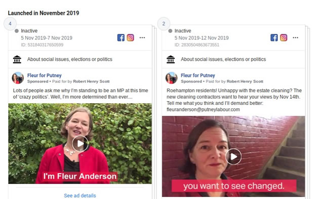 Fleur for Putney, a page promoting Fleur Anderson, has spent £1,471. It bought two adverts in November – one explaining why she is standing to be an MP, and another speaking to residents in Roehampton who are unhappy with the cleaning on their estate.
