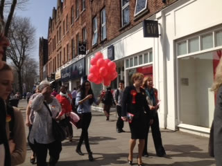 Party activists, announcing themselves with red balloons and placards, flanked Izzard and candidate Ruth Cadbury as they made their way from the Labour Party headquarters to Turnham Green, where he chatted to office workers and mothers with children, before winding their way along the High Road stopping at shops and cafes.
