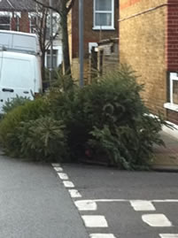 Residents are requested not to leave trees on pavements unless there is absolutely nowhere else at the front of their property to leave it. Trees should only be left out on normal collection days and not before. The trees on the left are on the corner of Felsham & Fanthorpe Rds!