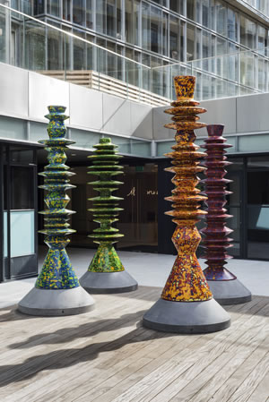 Malaysian artist Haffendi Anuar has created a site-specific series of pilotis, traditional architectural columns that lift a building above ground or water and which are commonly found in stilted dwellings, such as fishermen’s huts, across Asia. Within the context of Battersea Power Station, Machines for Modern Living are intended as surrogates of Battersea Power Station's chimneys.