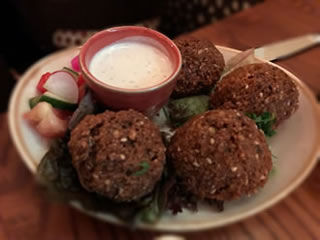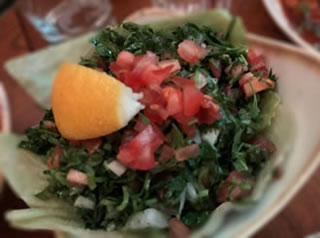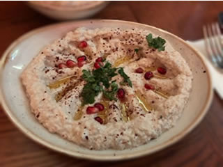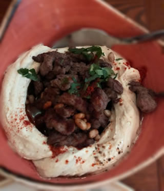 The falafel (£5.95) were divine - crunchy on the outside yet moist and light on the inside and served with tahini sauce, and the Moutabal Baba Ganouj (£6.95) with olive oil and pomegranate seedswas delightfully more-ish. Lamb is, as you would expect, big on the menu including the delicate parcels of Lamb Samboska (£6.95); Houmous Awarma (£7.50 ) - a smooth rich houmous topped with fried diced lamb and pine nuts; and deliciously seasoned Kofta Arayes (£7.50) - a pita bread stuffed with minced lamb. To make sure we had 1 of our 5 a day we ordered the ubiquitous chopped salad of the Middle East fattoush, it was just what was need to refresh the palate.