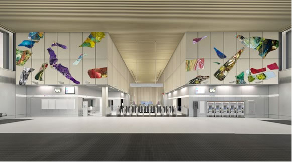 Da Cunha’s Sunset, Sunrise, Sunset (above) is inspired by the former control room at Battersea Power Station and will stretch to almost 100 metres in length. Da Cunha will be using a rotating billboard to create two friezes which will face each other along the length of the ticket hall. Vertical bars will represent the production and output of electricity provided by the Power Station in its previous era and the friezes will be made up of different strands gradually fading from one colour to another over the length of the entire image. The colours have been extracted from photos of London sunsets and sunrises.