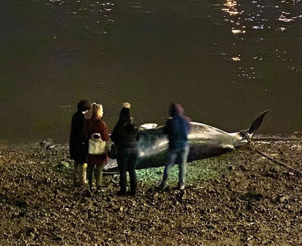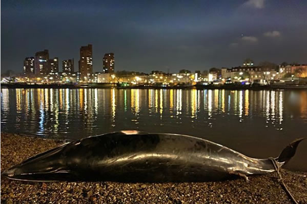 A dead whale which washed up onto the shore at Battersea Bridge last weekend is believed to be of the ‘minke’ species according to the Port of London Authority (PLA). A patrol boat discovered the whale late on Friday evening (November 30th) following reports of sightings earlier in the day, but it is not yet known why the mammal died and why its body was washed so far upstream.