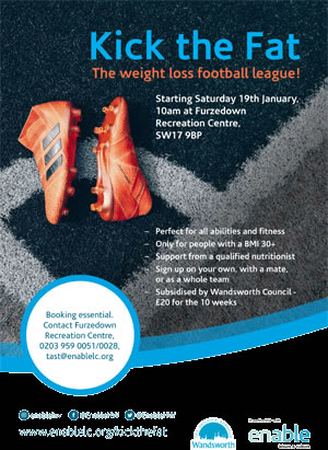 Kick the Fat runs for ten weeks at Furzedown Recreation Centre, Tooting. It will be delivered by Enable Leisure and Culture and subsidised by Wandsworth Council, bringing the cost down to £20 for the whole ten-week course.