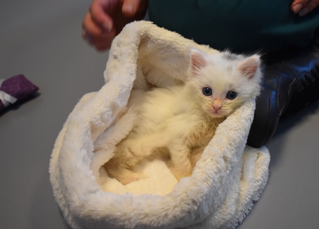 The tiny white kitten was rushed to Battersea's iconic London centre last month by his new owner, who quickly realised he was far younger than he'd been advertised online.