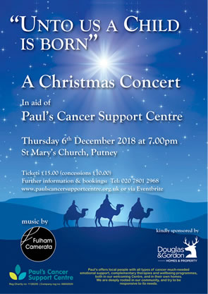 "The Paul’s Christmas Concert takes place on Thursday 6th December 2018 at 7.00pm, at St Mary’s Church, Putney High Street. We are delighted that the event has been very generously sponsored by Douglas & Gordon, and we have also received kind donations from local businesses Glug Wine Merchants, Stay Wild Flowers and Sainsbury’s Riverlight."