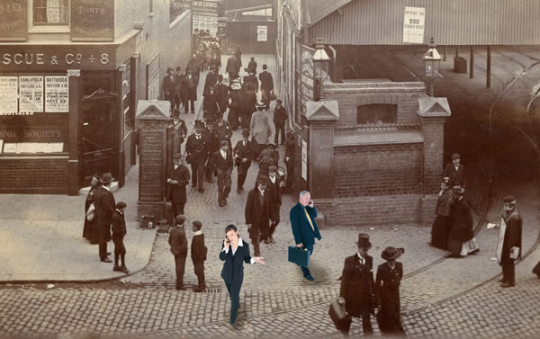 Left: An image of the old entrance to Clapham Junction station, with modern characters inserted into the photograph (this is the reverse of what the photo project and exhibition will create).
